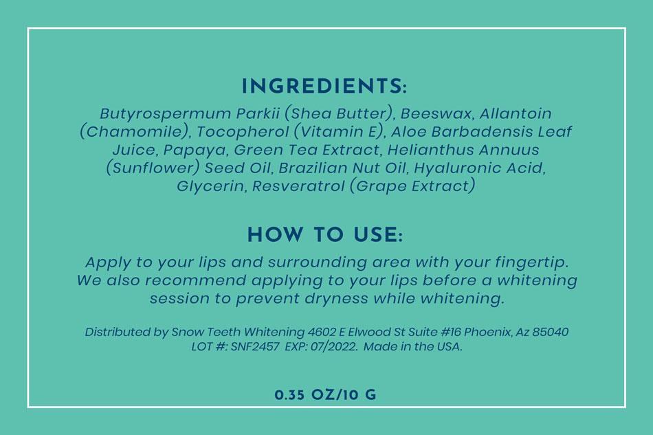 Pro tips: Apply to your lips before a whitening session to prevent dryness while whitening. This lip balm is great for other areas of the body as well. Spread around past the lip area to eliminate the appearance of wrinkles not only on the lips, but in the vulnerable surrounding areas. Our formula is also great for moisturizing fingertips and cuticles whenever you notice dryness. Keep one in your nightstand and another in your makeup bag so you always have it available for a quick touch-up. The reflective lid can serve as a little portable mirror in a pinch.